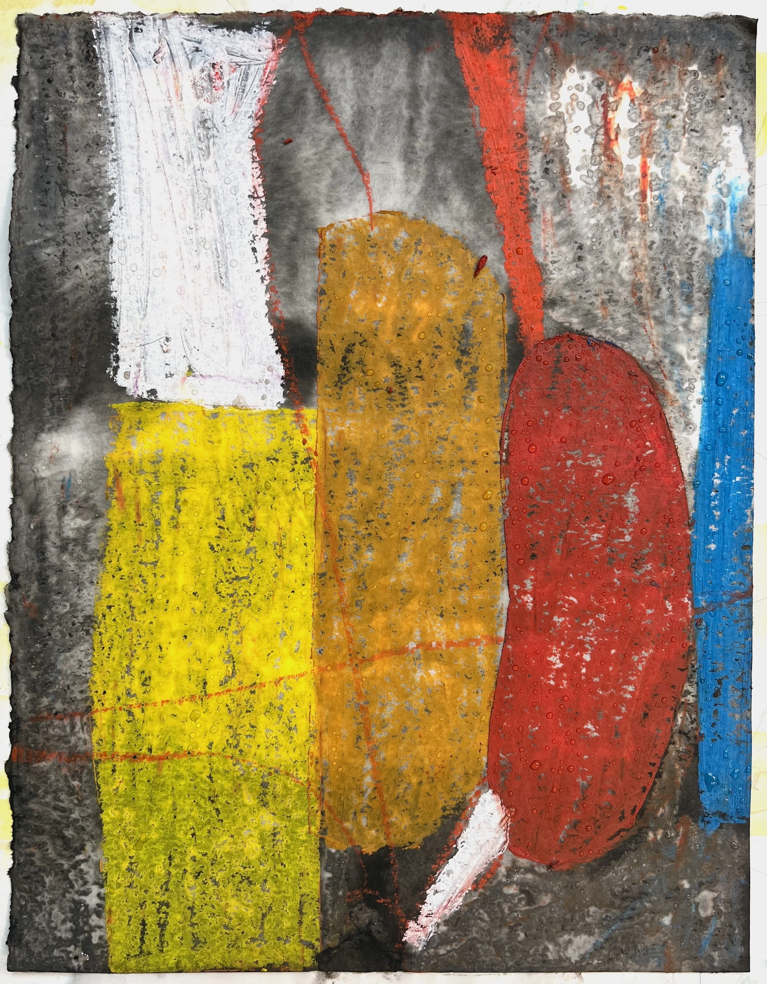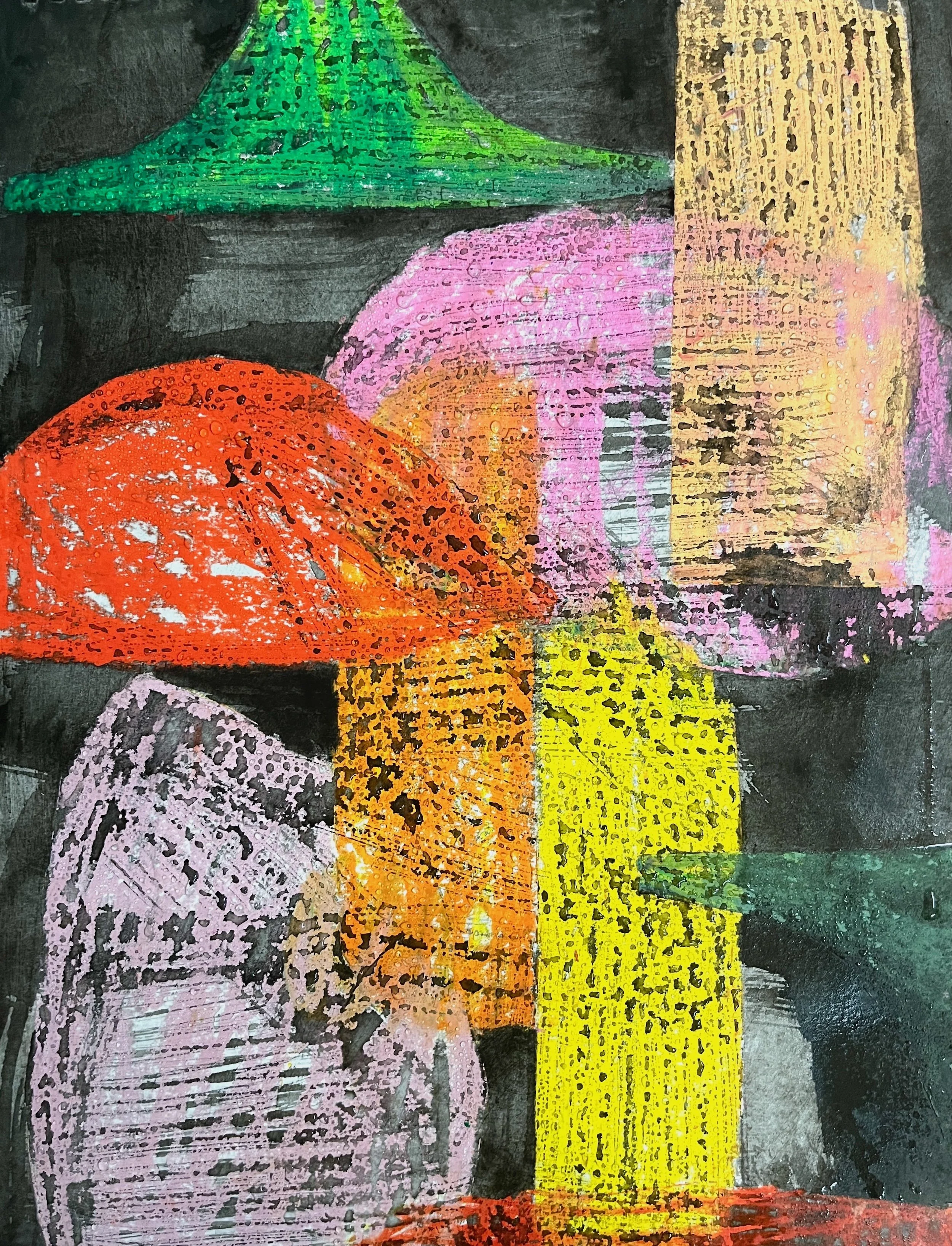 Initiated in July 2023, Collaboration 8 is a series of eight mixed media works on paper. This endeavor brought eight artists together for a year long art-making engagement. Participating artists are Helen Hiebert, Robyn Love, Emily Pratt, Liz Borowski, Pearlyn Tan, Samyak Yamauchi, Jennifer Foran and Roberta Aylward. The mark-making began on eight sheets of handmade cotton paper by Helen Hiebert, each measuring 8 x 8 inches. Each artist left their mark on every piece, in random turns, and only once, until every piece contained marks by all eight artists. The result is a series of unique and unexpected works highlighting a variety of imagery and materials.